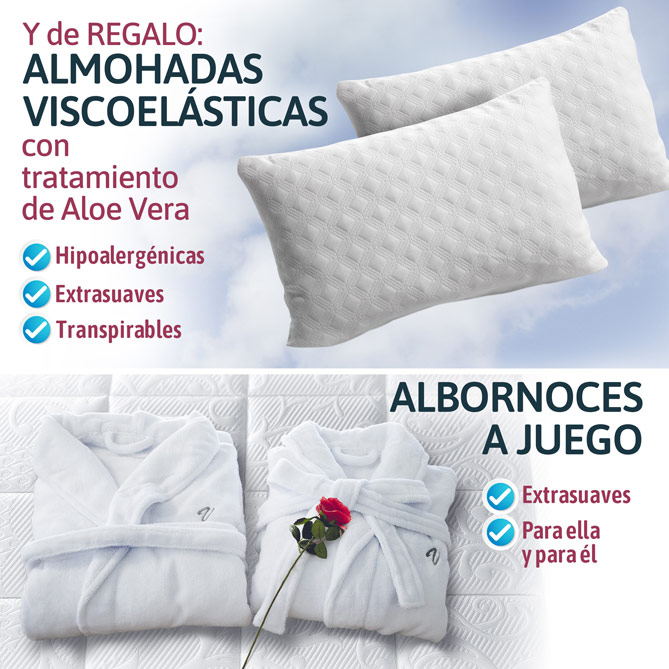 Además, para ti hemos reservado de REGALO unas Almohadas de Viscoelástica a juego ¡y una pareja de Albornoces extrasuaves GRATIS!